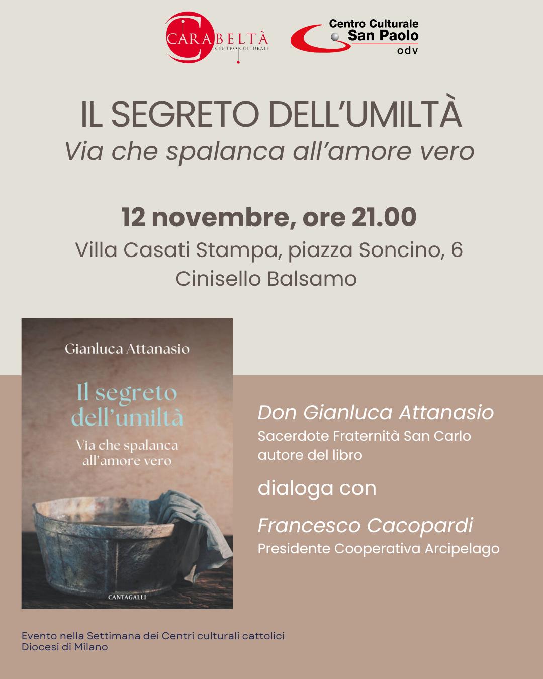Mercoledì 12 novembre, don Gianluca Attanasio presenterà il suo nuovo libro Il segreto dell'umiltà: via che spalanca all'amore vero. A dialogare con l'autore sarà Francesco Cacopardi, presidente della Cooperativa Arcipelago. L'incontro si terrà alle ore 21:00 negli spazi di Villa Casati Stampa a Cinisello Balsamo (MI).
